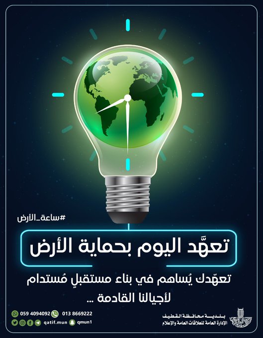 أعلنت بلدية محافظة القطيف، مشاركتها في ساعة الأرض، وكذلك البلديات التابعة لها، بهدف التقليل من استهلاك الطاقة والمحافظة على البيئة.