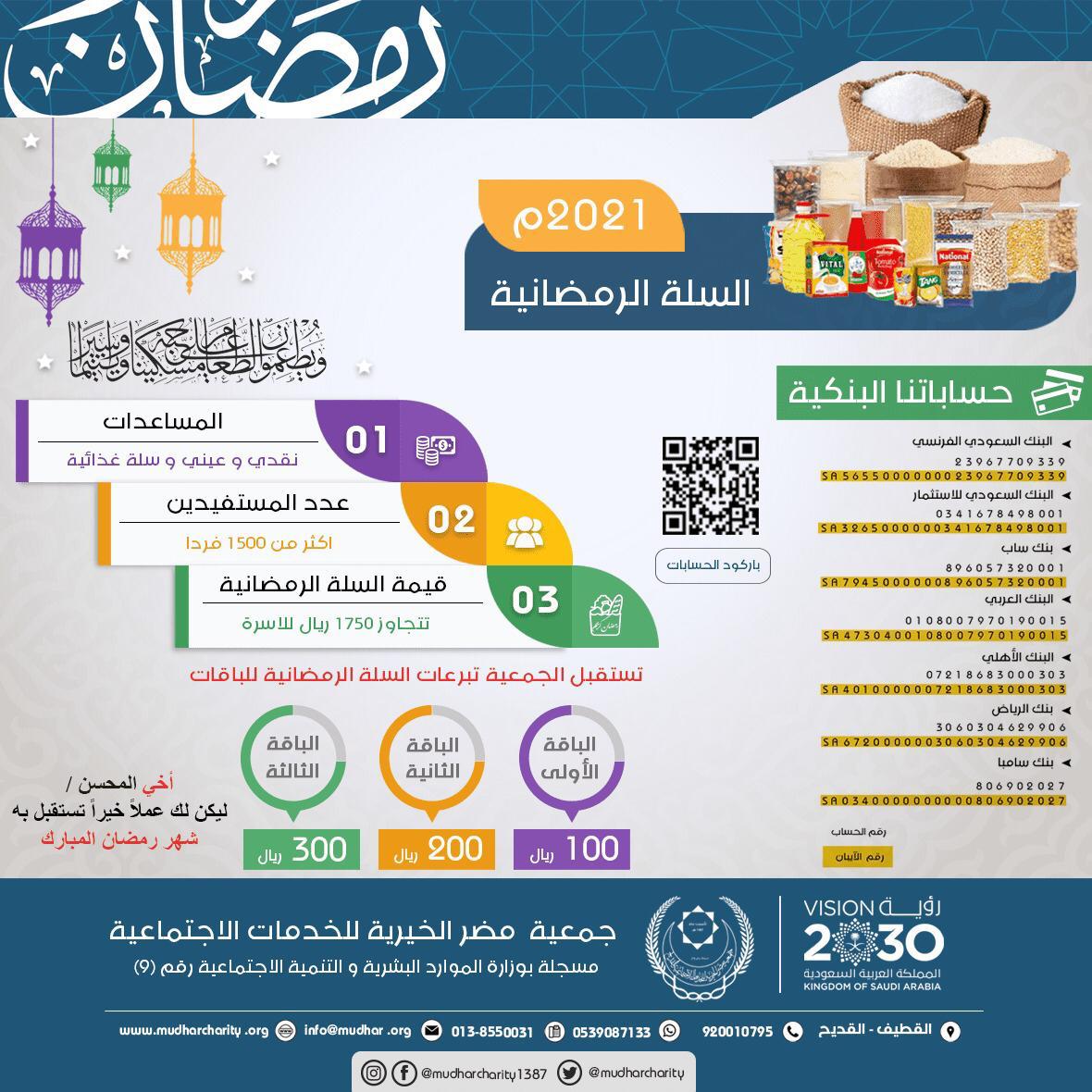 وزعت جمعية مضر الخيرية في القديح، 250 سلة رمضانية على الأسر المتعففة وأسر الأيتام، التي بلغ مجموع أفرادها 1500 فرد، كما أودعت مساعدات مالية في الحسابات البنكية للأسر، بلغ قدرها 300 ريال للفرد الواحد.