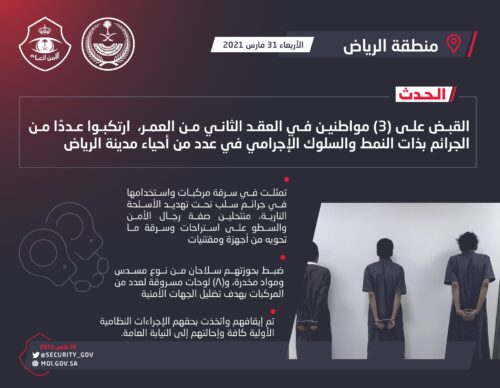 وقال المتحدث الإعلامي لشرطة منطقة الرياض، الرائد خالد الكريديس، في بيان “إن المتابعة الأمنية لمكافحة جرائم الاعتداء على الأموال وتعقب مرتكبيها، أسفرت عن تمكن الجهة المختصة بشرطة المنطقة من القبض على 3 مواطنين في العقد الثاني من العمر، ارتكبوا عددًا من الجرائم بذات النمط والسلوك الإجرامي في عدد من أحياء مدينة الرياض”.