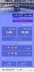 وكشفت الهيئة عن أداء شبكات الاتصالات بمكة المكرمة لليوم نفسه، حيث بلغ حجم استهلاك البيانات 3.46 آلاف تيرابايت، بما يعادل مشاهدة 1.42 مليون ساعة من المقاطع المرئية بدقة 1080p HD.