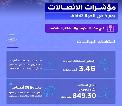 قدرت هيئة الاتصالات وتقنية المعلومات حجم استهلاك الفرد للبيانات في مكة المكرمة خلال اليوم الثامن من ذي الحجة، بـ849 ميجابايت، متجاوزًا 3 أضعاف معدل الاستهلاك العالمي للفرد.