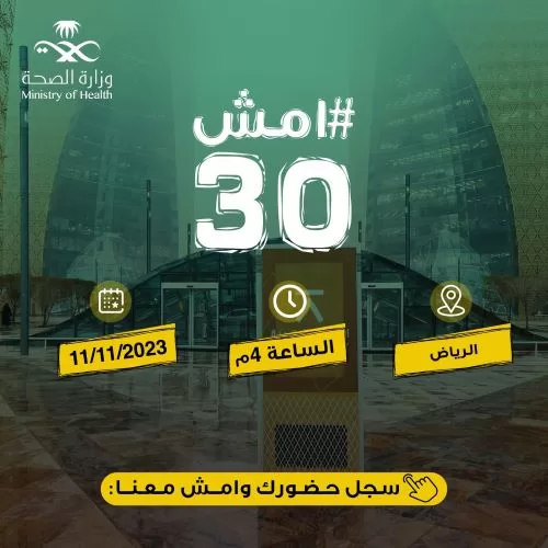 تطلق وزارة الصحة يوم 11 من شهر نوفمبر الجاري، حملة توعوية في جميع مناطق ومحافظات المملكة، وذلك تحت شعار “امش30”.