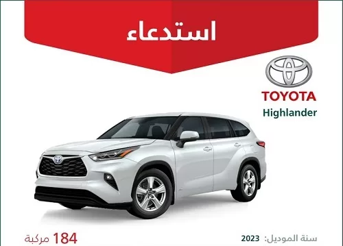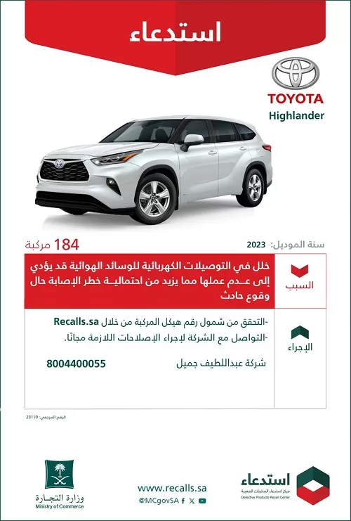 أعلنت وزارة التجارة، عن استدعاء 184 سيارة تويوتا “Highlander” موديل 2023م.