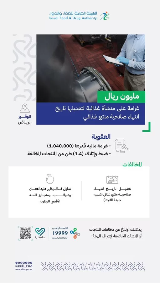 ويأتي القرار لقيام الشركة التي يقع مقرها في مدينة الرياض، بتعديل تاريخ انتهاء صلاحية المنتج الغذائي، مما يعد مخالفًا لنظام الغذاء ولائحته التنفيذية.