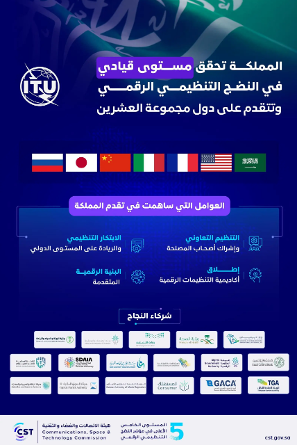 أعلن الاتحاد الدولي للاتصالات عن تحقيق المملكة مستوى قياديًّا في النضج التنظيمي الرقمي، لتتقدم بذلك على دول مجموعة العشرين، حيث جاءت بعدها الولايات المتحدة الأمريكية، وفرنسا، وإيطاليا، وجمهورية الصين الشعبية، إضافة إلى اليابان، وروسيا.