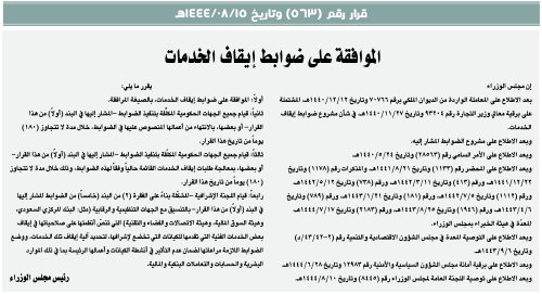 ونشرت جريدة “أم القرى”، تعديل المدة المحددة للعمل بضوابط إيقاف الخدمات، ليكون العمل بها بعد (360) يوماً من تاريخ نشرها بدلاً من (180) يوماً.