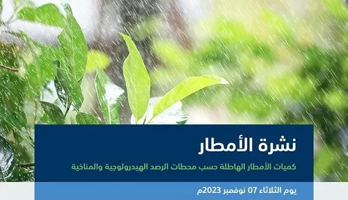 وأوضح التقريرٍ اليومي لوزارة البيئة والمياه والزراعة؛ لرصد كميات هطول الأمطار في مناطق المملكة، أن المحطات رصدت هطول أمطار في مناطق: (الرياض، مكة المكرمة، المدينة المنورة، القصيم، عسير، حائل، جازان، الباحة، الجوف) وذلك بكميات تفاوتت بين 56.3 ملم و0.6 ملم، وذلك من الساعة التاسعة صباح الاثنين 6 نوفمبر حتى الساعة التاسعة صباح الثلاثاء 7 نوفمبر 2023م – (24 ساعة).