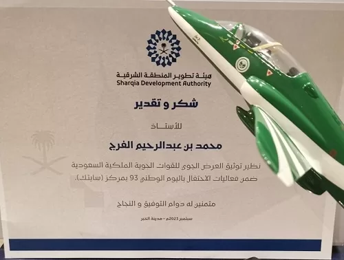كرمت هيئة تطوير المنطقة الشرقية المصور محمد بن عبدالرحيم الفرج، بشهادة شكر وتقدير نظير جهوده في توثيق فعاليات اليوم الوطني 93 بمركز سايتك.