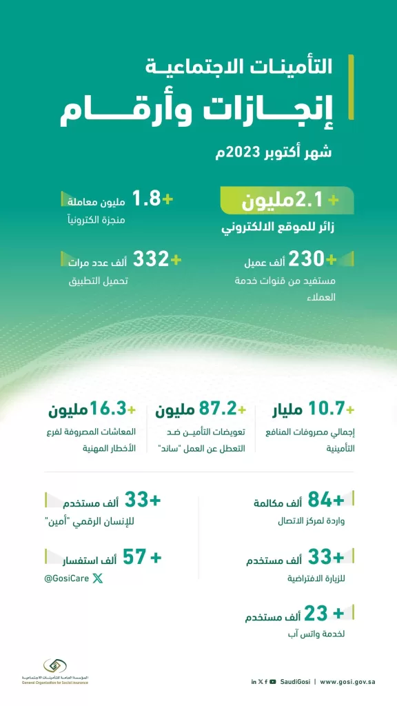 وعن أداء قنوات التواصل الإلكترونية استعرض التقرير أبرز الأرقام وأعداد المستخدمين للخدمات والمنصات الإلكترونية التي أتاحتها المؤسسة لعملائها، حيث بلغ عدد المستخدمين لخدمة الزيارة الافتراضية وخدمة الإنسان الرقمي “أمين” أكثر من 33 ألف عميل لكل خدمة، فيما تخطى مستخدمو خدمة “واتسآب التأمينات” أكثر من 23 ألف عميل، فيما تجاوز عدد الاستفسارات الواردة لحساب المؤسسة للعناية بالعملاء في منصة X أكثر من 57 ألف استفسار، وأن عدد المكالمات الواردة لمركز الاتصال الهاتفي لخدمة العملاء لشهر أكتوبر الماضي بين التقرير أنها تخطت حاجز 84 ألف مكالمة.