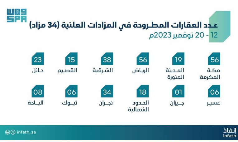 وأوضح المركز أن المزادات تتضمن إقامة 11 مزادًا في منطقة مكة المكرمة لعرض 56 فرصة عقارية متنوعة، و6 مزادات لعرض 56 عقارًا بمنطقة الرياض، و38 عقارًا بمنطقة الشرقية من خلال 3 مزادات علنية، و15 فرصة عقارية في مزادين بمنطقة القصيم، ومزادًا واحدًا في منطقة الحدود الشمالية يعرض فيه 18 عقارًا، إضافة لعرض 23 عقارًا بحائل، و6 عقارات بمنطقة عسير، و34 عقارًا في منطقة نجران، و6 عقارات في منطقة تبوك، ومزادًا بالمدينة المنورة يعرض من خلاله 19 عقارًا.