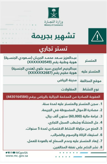 ونشرت الوزارة الحكم الصادر من المحكمة الجزائية بالرياض المتضمن عقوبة السجن لمدة سنة للمدانين، ومصادرة الأموال الناتجة عن ارتكاب جريمة التستر، وفرض غرامة مالية 60 ألف ريال، بالإضافة إلى العقوبات التبعية المقررة نظاماً، وهي: حل المنشأة وشطب السجل التجاري، والمنع من مزاولة النشاط الاقتصادي محل الجريمة وأي عمل تجاري آخر لمدة 5 سنوات، واستيفاء الزكاة والرسوم والضرائب، وابعاد المتستر عليه عن المملكة وعدم السماح له بالعودة للعمل، ونشر الحكم على نفقة المخالفين.