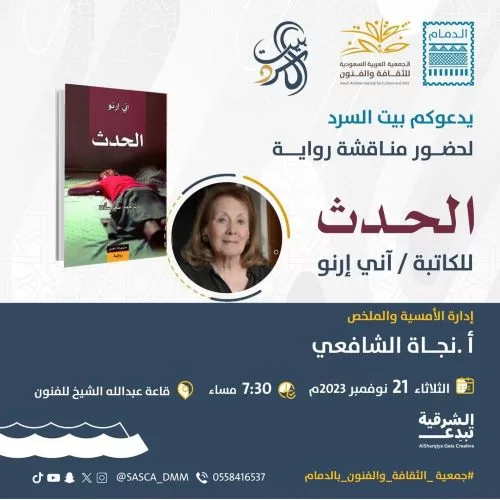 ينظم بيت السرد بالإشتراك مع فرع جمعية الثقافة والفنون بالدمام في الساعة الثامنة من مساء يوم الثلاثاء المقبل 21 من نوفمبر الجاري، بقاعة عبدالله الشيخ للفنون، أمسية ثقافية تيديرها نجاة الشافعي لمناقشة رواية الحدث، للكاتبة آني إرنو.