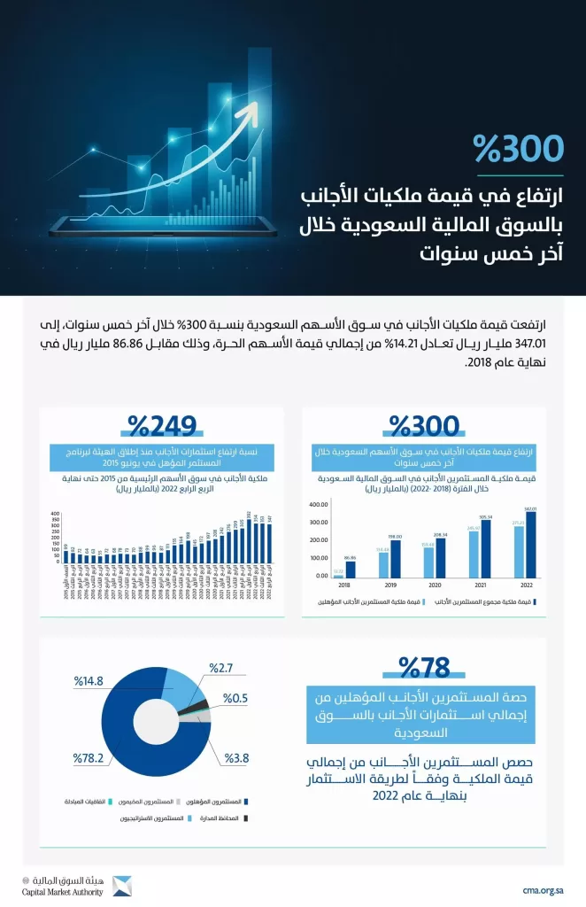 ويعد معدل تزايد الاستثمارات الأجنبية خلال عام 2022م هو الأعلى منذ انضمام السوق إلى مؤشرات الأسواق الناشئة في عام 2019م، الذي أسهم في ارتفاع ملكية المستثمرين الأجانب المؤهلين بنسبة 1877% بنهاية عام 2022م ليصل إلى 271.23 مليار ريال، مقارنة بـ 13.7 مليار في 2018م و134.48 مليار ريال في عام 2019م، فيما شكلت نسبة ملكية المستثمرين الأجانب المؤهلين 78% من إجمالي استثمارات الأجانب في السوق السعودية بنهاية العام الماضي.