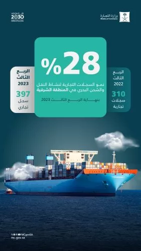 وبين أن أبرز خمسة أنشطة سجلت تنامياً فيها بنهاية الربع الثالث 2023 هي: الخدمات اللوجستية بنسبة 73%، والأندية البحرية بنسبة 72%، وإنشاء الأرصفة والموانئ البحرية بنسبة 47%، والذكاء الاصطناعي بنسبة 45%، والنقل والشحن البحري بنسبة نمو 27%. ويعد نشاط النقل والشحن البحري أحد أنشطة قطاع النقل والخدمات اللوجستية، وهو قطاع حيوي في رؤية المملكة 2030 لترسيخ مكانة المملكة كمركز لوجستي عالمي.