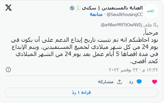 يوافق يوم 24 من كل شهر ميلادي إيداع دعم سكني للمستفيدين، وعلى إثر هذا الإعلان الرسمي فقد استقبل حساب العناية بالمستفيدين العديد من الاستفسارات بشأن تأخر نزول الدعم لليوم الخميس الموافق 23 نوفمبر 2023، علما بأن غدا يوافق يوم إجازة أسبوعية الجمعة 24 نوفمبر 2023، بدوره حرص برنامج سكني على أن يحسم الجدل ويوضح موعد صرف الدعم السكني للمستفيدين عبر منصته الرسمية على إكس.