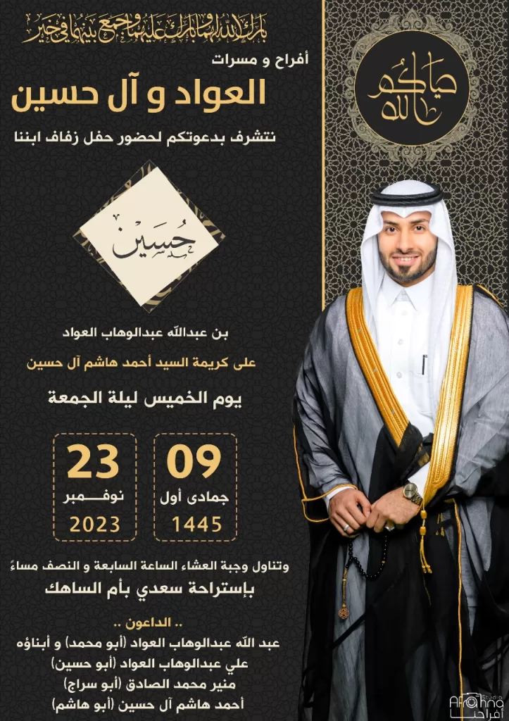 اختفلت عائلة العواد وآل حسين، مساء أمس الخميس، بزفاف الشاب حسين بن عبدالله عبدالوهاب العواد إلى كريمة السيد أحمد هاشم آل حسين.