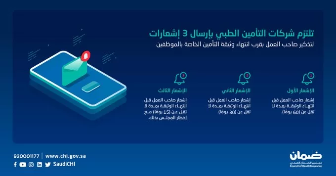 أوضح مجلس الضمان الصحي أن شركة التأمين الطبي ملزمة بتذكير صاحب العمل بقرب انتهاء وثيقة التأمين الصحي الخاصة بالموظفين عبر 3 إشعارات.