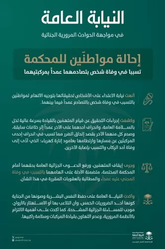 وأكدت النيابة العامة على حفظ النفس البشرية وصونها من الجناية كونها أحد الضروريات الخمس، وأن التلاعب بها أو الاستهتار بالأرواح، موجب للمساءلة الجزائية المشددة، كما أكدت على أهمية الالتزام بالأنظمة المرورية، وعدم التهاون بقيادة المركبات وسلامة راكبيها.