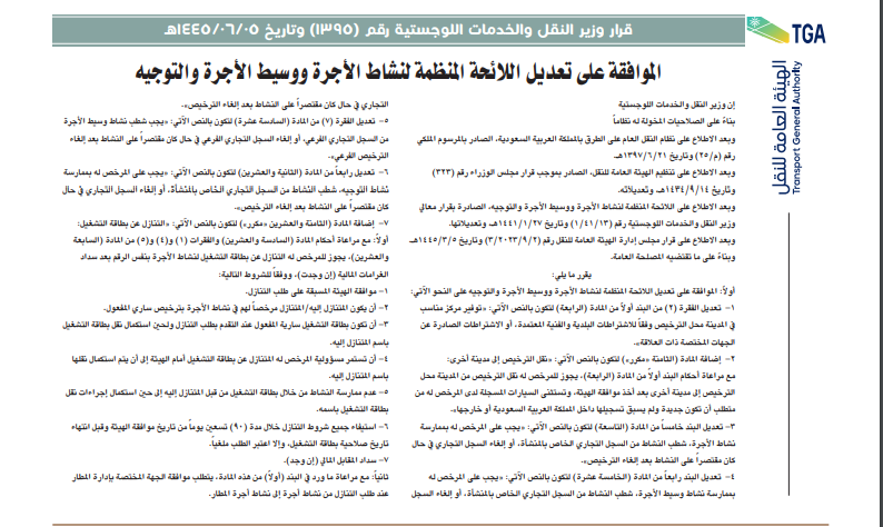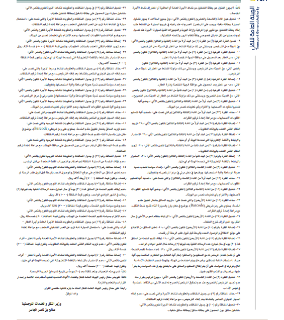 أيضًا، تم إلغاء شرط وجود شعار يحتوي على رمز شريطي (Barcode) في السيارات أثناء تقديم خدمات النقل، وتم تعديل النصوص المتعلقة بالربط بنظام شموس الأمني للنقل بين المدن أو خارج البلاد.