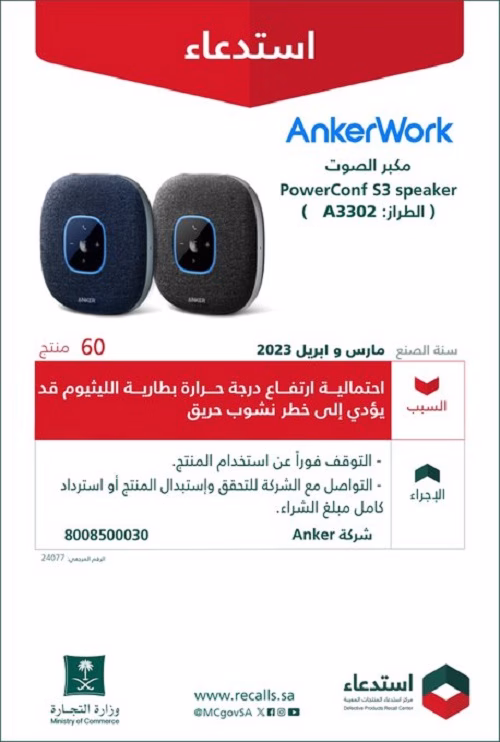 أعلنت وزارة التجارة، عن استدعاء 260 مكبر صوت من نوع soundcore Anker SoundCore Speaker، طراز A3102، و AnkerWork PowerConf S3 speaker، طراز A3302، إنتاج مارس وإبريل 2023م.