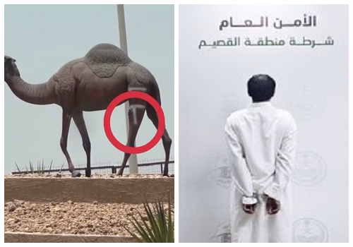 قبضت شرطة منطقة القصيم على مواطن، لإتلافه ممتلكات عامة والعبث بها، تمثلت في الكتابة على مجسم ناقة في القصيم وتشويهه.
