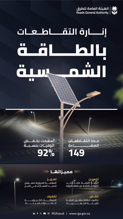 “الطرق”: وفيات حوادث التقاطعات انخفضت بنسبة 92% بعد إنارتها بالطاقة الشمسية