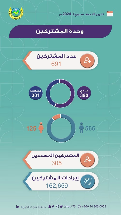 كشفت وحدة المشتركين في جمعية تاروت الخيرية، أن عدد المشتركين خلال النصف الأول للعام الحالي 2024 قد بلغ 691 مشتركاً، وفق ما ذكرته منسقة وحدة المشتركين آمنة الصفار.