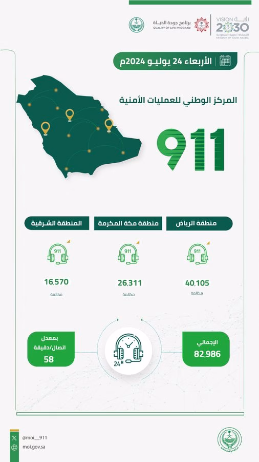 تلقى المركز الوطني للعمليات الأمنية أمس الأربعاء، عبر رقم الطوارئ الموحد (911) في مناطق الرياض، ومكة المكرمة، والمنطقة الشرقية، (82.986) اتصالًا، بمعدل (58) اتصالًا في الدقيقة.
