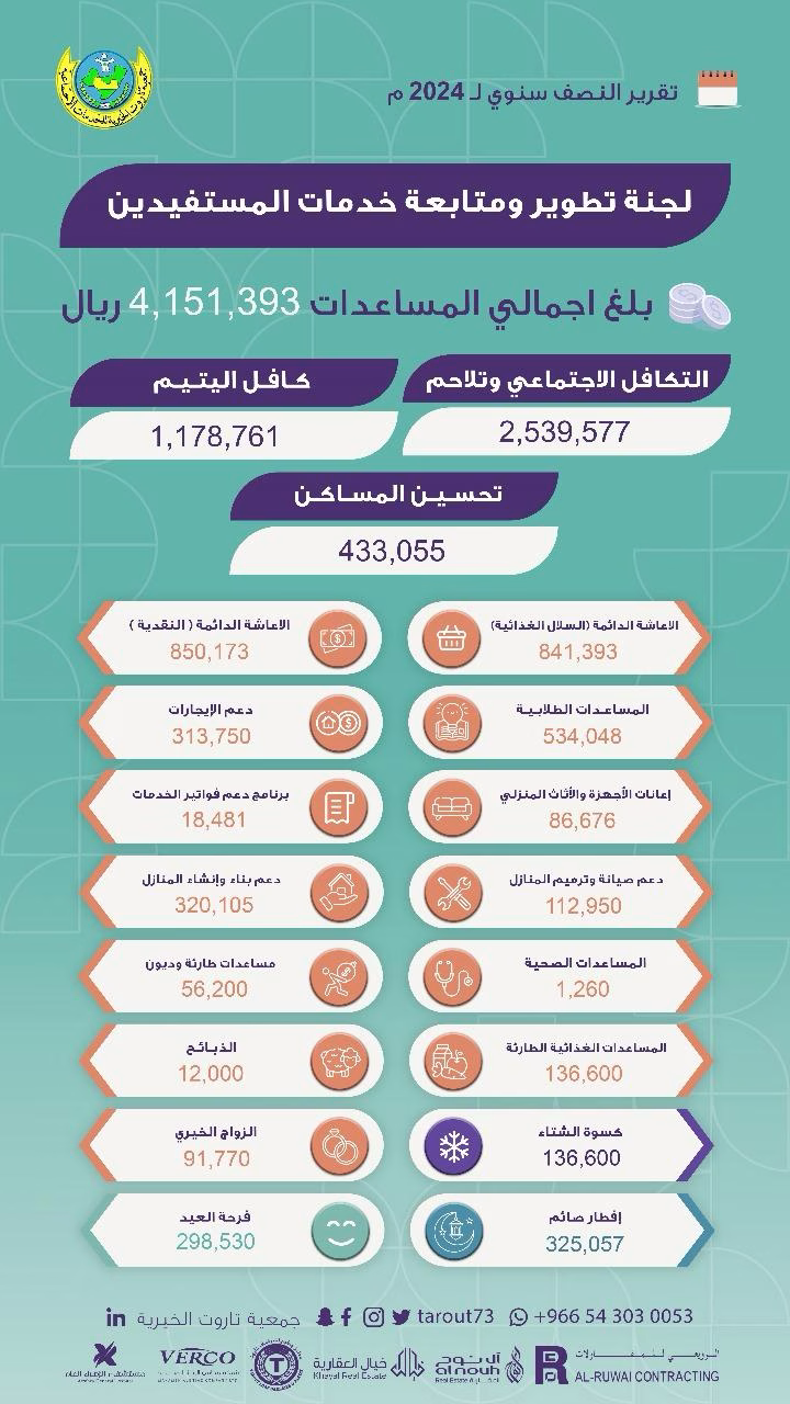 أعلن مجلس إدارة جمعية تاروت الخيرية عن مجموع المساعدات التي قدمتها الجمعية خلال النصف الأول من عام 2024م، التي بلغت 4,151,393 ريالاً عبر إحصائية توضح تفاصيل نشاط ومساعدات اللجان ذات الصلة المباشرة بالمستفيدين.
