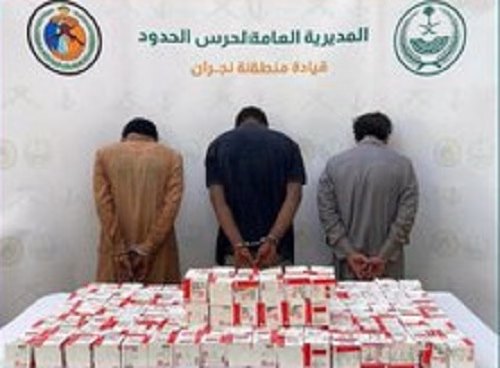 فيما أحبطت الدوريات البرية لحرس الحدود في قطاع سقام بمنطقة نجران وسط خطة أمنية وميدانية، تهريب (27,600) قرص خاضع لتنظيم التداول الطبي، حيث قبضت على مهربيها وهما مخالفان لنظام أمن الحدود من الجنسية الإثيوبية، وبالتعاون مع المديرية العامة لمكافحة المخدرات قُبض على مستقبلها وهو مواطن، وجرى استكمال الإجراءات النظامية الأولية بحقهم، وتسليمهم والمضبوطات لجهة الاختصاص، وذلك ضمن جهود المديرية العامة لحرس الحدود في الحرب على المخدرات.