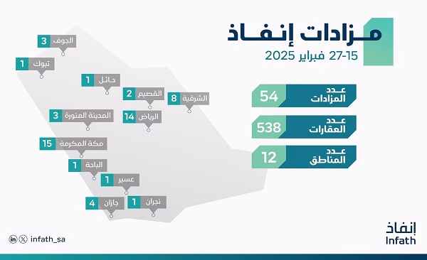 وبيَّن “إنفاذ” أنه يمكن الاطلاع على تفاصيل وشروط المشاركة في المزادات، والاطلاع على الأصول بجميع تفاصيلها عبر الدخول للموقع الإلكتروني لـ “إنفاذ” infath.gov.sa، ومن ثم التوجه لصفحة المزادات.