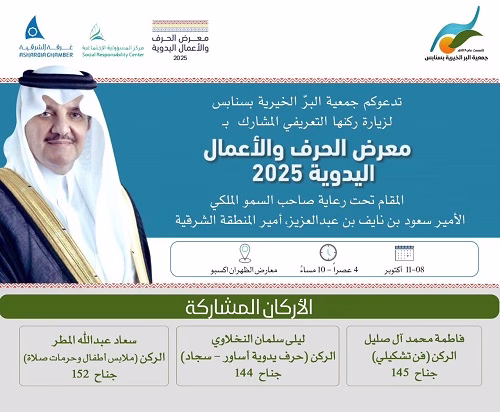 تدعم جمعية البر الخيرية بسنابس، 3 حرفيات سعوديات في معرض الحرف والأعمال اليدوية 2025″ المنظم من غرفة الشرقية، تحت رعاية صاحب السمو الملكي الأمير سعود بن نايف بن عبدالعزيز أمير المنطقة الشرقية.