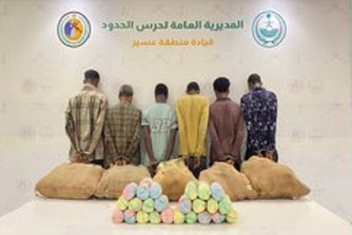 من جهة أخرى قبضت الدوريات البرية لحرس الحدود في قطاع الربوعة بمنطقة عسير، على (6) مخالفين لنظام أمن الحدود من الجنسيتين اليمنية والإثيوبية، لتهريبهم (100) كيلوجرام من نبات القات المخدر، وجرى استكمال الإجراءات النظامية الأولية بحقهم، وتسليمهم والمضبوطات لجهة الاختصاص.
