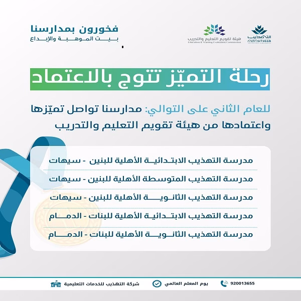 تستمر مدارس التهذيب في كتابة قصة نجاحها للعام الثاني على التوالي، حيث أثبتت تميزها من خلال اعتمادها من هيئة تقويم التعليم والتدريب، لتكون بذلك من بين أفضل المدارس المتميزة في المملكة.
