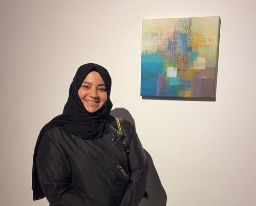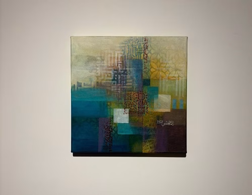 وتترجم الجشي هذه المعاني عبر ألوان نابضة بالحياة مستمدة من البيئة المحلية، حيث يتداخل الخط العربي مع طبقات لونية متناغمة، لتكوّن معًا تكوينًا بصريًا معاصرًا يحمل بعدًا روحانيًا عميقًا.