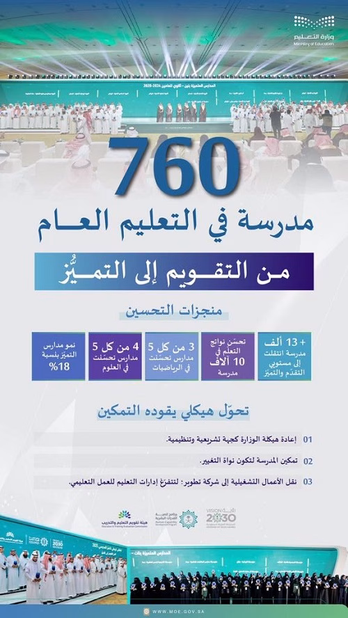 وأعلن أنه لأول مرة في تاريخ التعليم في المملكة، تم تقويم وتصنيف جميع مدارس المملكة في أكثر من ألفين ومئتي مدينة وقرية وهجرة، بتنفيذ ما يقارب من مليون ونصف زيارة صفية ومقابلة، ومئات الآلاف من الرحلات في مدن المملكة ومراكزها القريبة والنائية، كما أعلن عن تكريم (760) مدرسة حكومية وأهلية وعالمية، حصلت على مستوى التميز، مؤكدًا أن جودة التعليم والتميز المدرسي بلغت كل مكان في مملكتنا الغالية.
