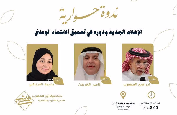 تنظم جمعية ابن المقرب للتنمية الأدبية والثقافية، ندوة حوارية بعنوان “الإعلام الجديد ودوره في تعميق الانتماء الوطني”.