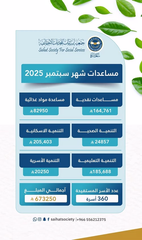 خلال سبتمبر.. مساعدات “سعادة” تجاوزت 670 ألف ريال صرفت على 360 أسرة