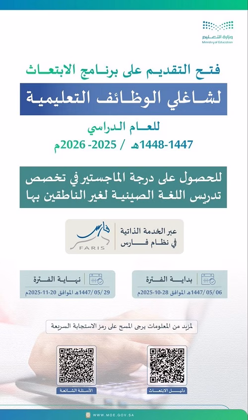 أعلنت وزارة التعليم، اليوم الثلاثاء، عن بدء التقديم على برنامج الابتعاث لشاغلي الوظائف التعليمية لدرجة الماجستير، في تدريس اللغة الصينية لغير الناطقين بها للعام الدراسي 1447هـ – 1448هـ.