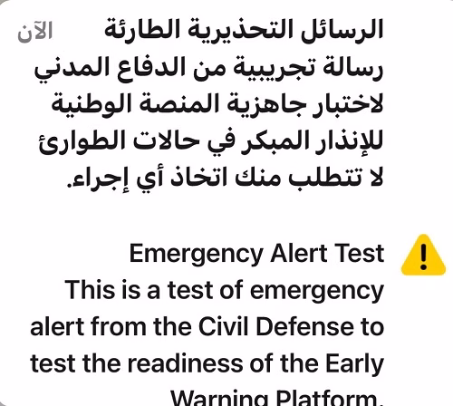 تلقى المواطنون قبل قليل، رسائل تحذيرية على الهواتف المتنقلة مصحوبة بنغمة صوتية مميزة، للتأكد من جاهزيتها، وذلك بالتزامن مع تنفيذ تجربة صافرات الإنذار.