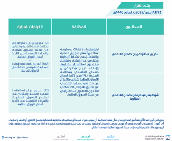 فيما تضمن القرار القطعي الثاني إدانة كل من بندر بن عبدالرحمن بن حمدان الغامدي، وشركة بندر عبدالرحمن حمدان الغامدي العقارية بمخالفة المادة الـ (31) من نظام السوق المالية، والمادة الخامسة من لائحة أعمال الأوراق المالية، وذلك لقيامهما بالاشتراك بممارسة عملاً من أعمال الأوراق المالية و المتمثل في نشاط (الإدارة) وذلك من خلال إنشاء وتشغيل صناديق استثمار عقارية، وإدانة بندر بن عبدالرحمن بن حمدان الغامدي بمخالفة المادة السابعة عشرة من لائحة أعمال الأوراق المالية لقيامه بالإعلان عن ذلك في حسابه الشخصي عبر تطبيق التواصل الاجتماعي (X)، دون الحصول على ترخيص من هيئة السوق المالية، وتغريمهم 2.7 مليون ريال.