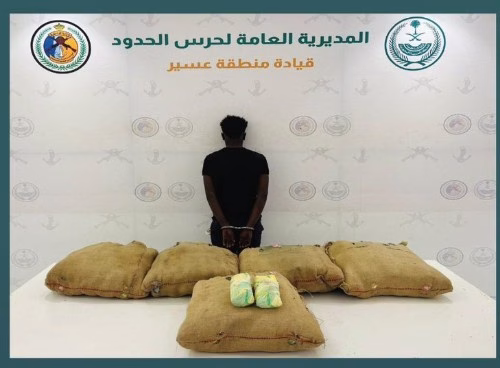 كما ضبطت الدوريات البرية لحرس الحدود في قطاع الربوعة بمنطقة عسير مخالف لنظام أمن الحدود من الجنسية الإثيوبية لتهريبه (110) كيلوجرامات من نبات القات المخدر.