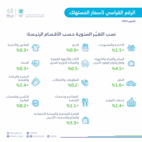 أوضحت الهيئة العامة للإحصاء أن معدل التضخم السنوي لمؤشر أسعار المستهلك في المملكة العربية السعودية بلغ نسبة 2.2% خلال شهر أكتوبر 2025، مقارنة بنظيره من العام السابق (أكتوبر 2024)، في حين بلغ معدل التضخم على أساس شهري نسبة 0.3% مقارنةً بشهر سبتمبر 2025م.