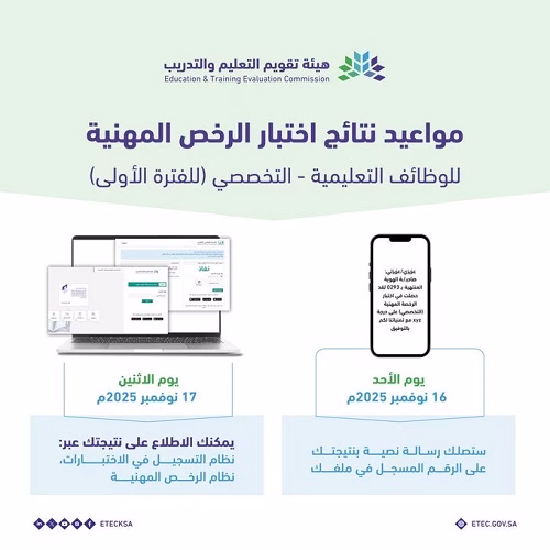 كشفت هيئة تقويم التعليم والتدريب، عن إعلان نتائج اختبار الرخصة المهنية، اليوم الأحد، وذلك عبر رسائل إلى الجوال.