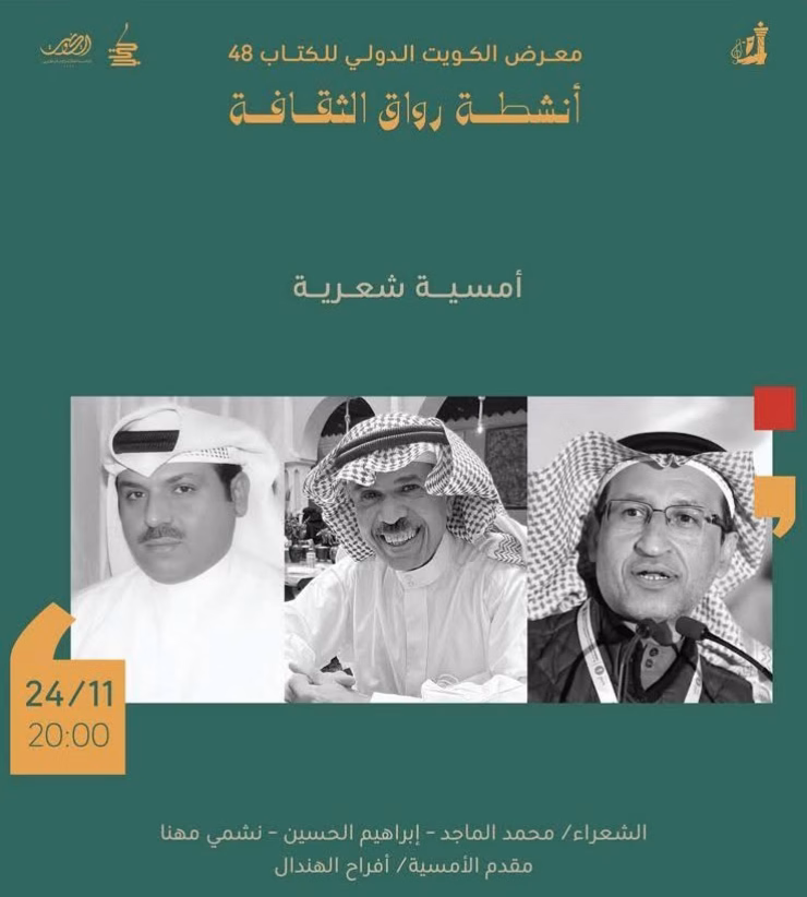 يستضيف معرض الكويت الدولي للكتاب 48، ضمن جناح أنشطة رواق الثقافة، أمسية شعرية، يوم الإثنين القادم الموافق 24 نوفمبر في تمام الساعة 8 مساء.