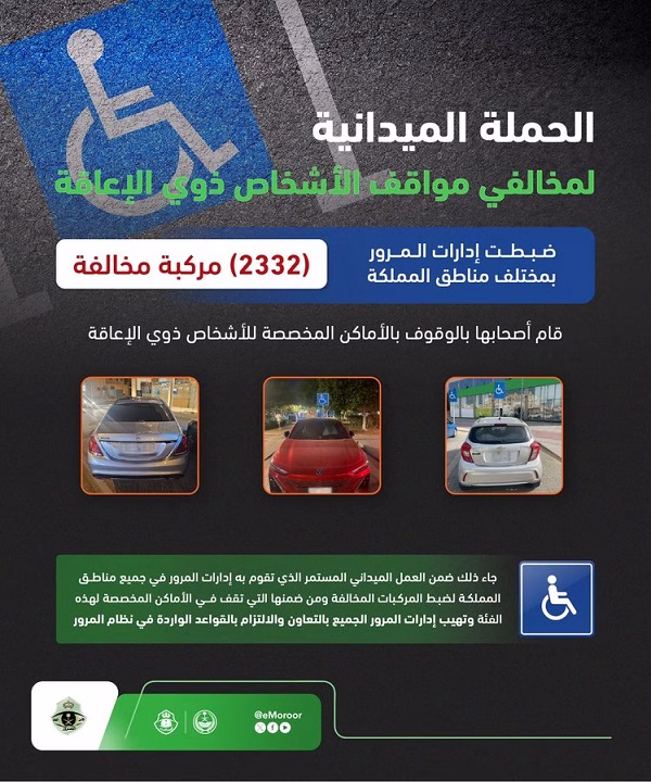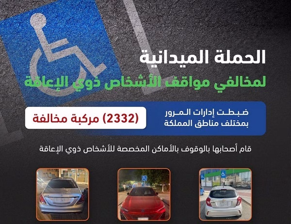 ضبطت إدارات المرور بمختلف المناطق 2332 سيارة مخالفة، قام أصحابها بالوقوف في الأماكن المخصصة لذوي الإعاقة.