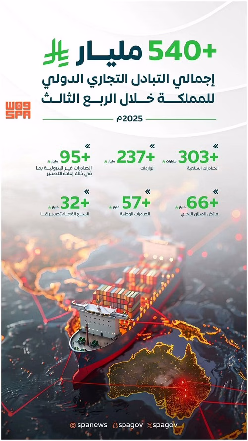 سجّل إجمالي حجم التجارة الدولية للمملكة خلال الربع الثالث من عام 2025م نحو (540.5) مليار ريال، محققًا نموًا سنويًا بلغت نسبته (8.6%) بما يعادل (43) مليار ريال مقارنة بالفترة المماثلة من عام 2024م التي بلغت (497.5) مليار ريال، وذلك حسب بيانات الهيئة العامة للإحصاء في نشرتها للتجارة الدولية للربع الثالث من العام الجاري.