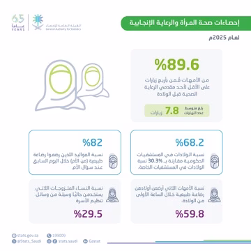 جاء ذلك وفقاً لما ذكرته الهيئة العامة للإحصاء، في إنفوجرافيك عبر حسابها في إكس، تضمن إحصاءات صحة المرأة والرعاية الإنجابية لعام 2025م.