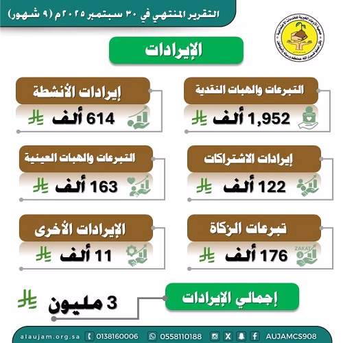ووفقًا للتقرير بلغ إجمالي إيرادات الجمعية نحو 3.038 مليون ريال خلال أول 9 أشهر من 2025م، مع تسجيل نمو في عدد من البنود، أبرزها: