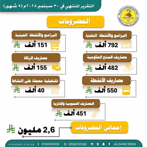 وفي جانب المصاريف، أوضح التقرير أن إجمالي مصروفات الجمعية بلغ 2.621 مليون ريال، خُصّص الجزء الأكبر منها للمساعدات والخدمات الاجتماعية المباشرة، حيث بلغ إجمالي المساعدات 1.580 مليون ريال بنسبة 60% من مصروفات الجمعية، وهو ما يعكس التزام الجمعية بتوجيه معظم مواردها نحو المستفيدين.